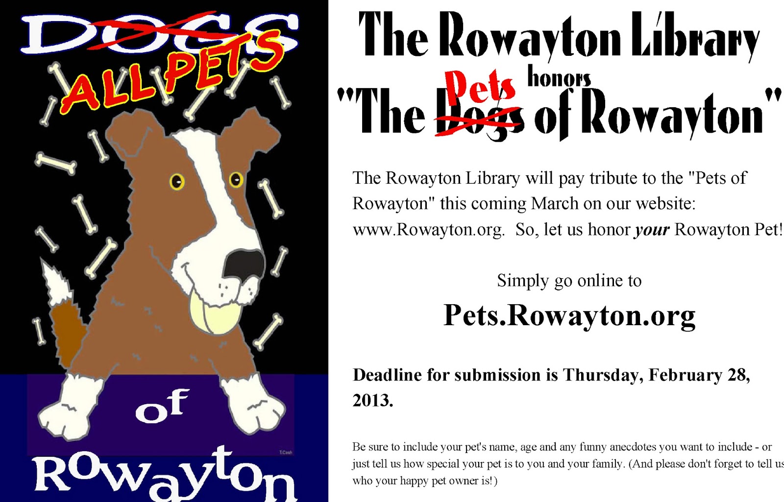 Please visit the Rowayton Library’s SPECIAL website http://pets.rowayton.org and fill out the form, attach a JPG format picture of your Pet (no people), and tell us your Pet's name, Breed/species/etc., your Pet's age, and funny anecdotes you want to include - or just tell us how special your pet is to you and your family. Include your name, your address, and your telephone number.